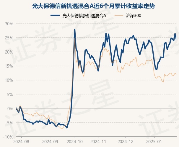 本站消息,1月27日,光大保德信新机遇混合A最新单位净值为0.9031元,累计净值为1.0278元,较前一交易日下跌1.58%。历史数据显示该基金近1个月上涨0.93%,近3个月上涨4.95%,近6个月上涨24.39%,近1年上涨22.79%。该基金近6个月的累计收益率走势如下图:
